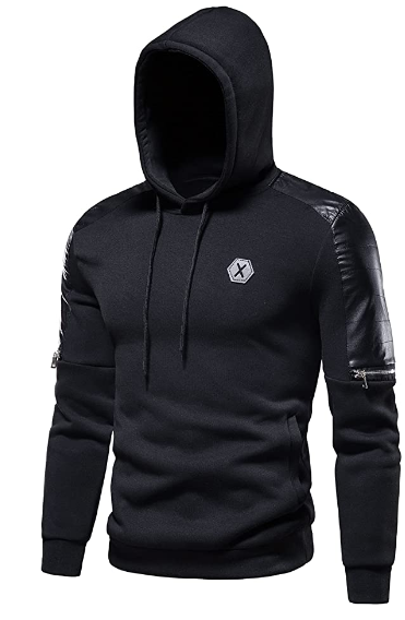Top: Double hood, adjustable drawcord, front kangaroo pocket. The faux leather on the shoulders and upper arms really stands out along with the shiny silver metal zippers. These inverted arm pockets are very deep and have plenty of room for my iPhone, keys, etc. The hexagonal X logo on the chest is also very attractive and eye-catching.